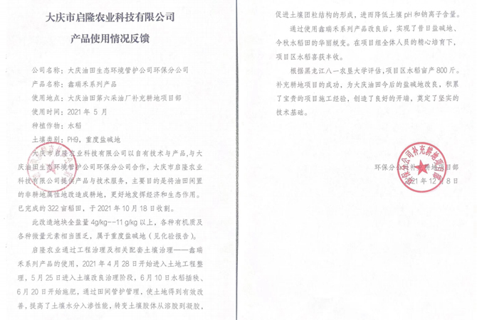 與多所高校、研究院、各大種業(yè)企業(yè)合作種植改良鹽堿地水稻。在黑龍江、吉林、內蒙古等地有多處示范基地。在新疆等地區(qū)種植草木,環(huán)境綠化等工程。幾年來,啟隆人大力弘揚“創(chuàng)新、堅韌、拼搏、開拓”的企業(yè)精神,在研發(fā)上勇攀高峰。大慶啟隆 的企業(yè)宗旨是“誠信于鹽堿地的朋友,服務于鹽堿地的朋友”,努力為鹽堿地改良做出積極的貢獻。